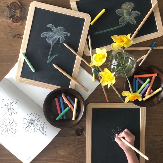 This is just another alternative to the dry erase boards. We use them for writing, spelling, math, and drawing. We primarily use Crayola chalk and these slate chalk pencils. I also love these colored chalk pencils and this chalk marker.