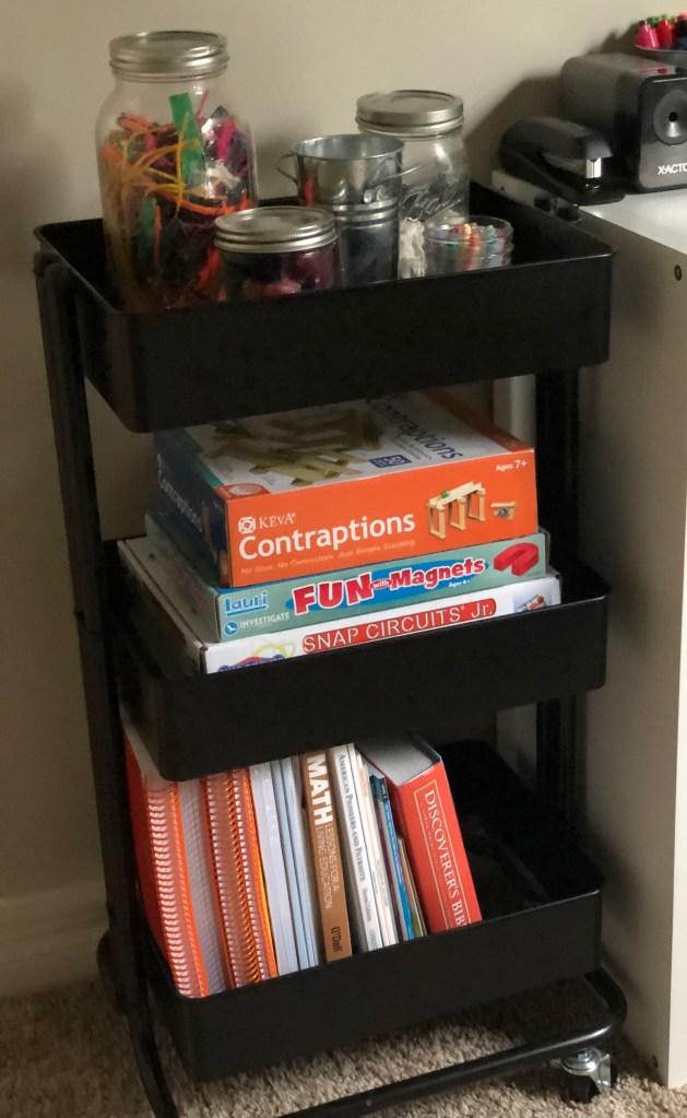 Another great option for limited space storage is a rolling cart. It’s a perfect way to store multiple resources, books, and supplies. And the great thing about them is they’re on wheels and can be moved throughout your home! I’ve also seen storage compartments that fit perfectly inside the cart!