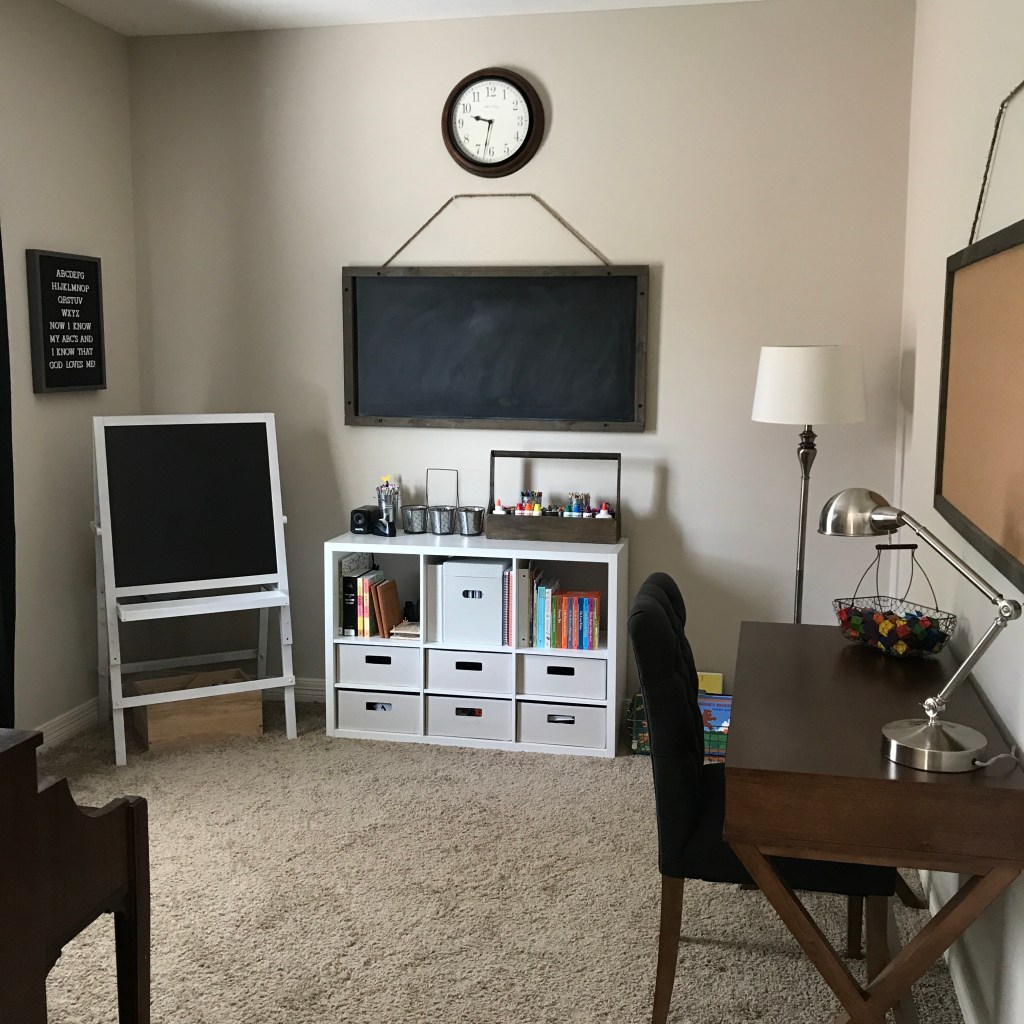 If you have a room you don’t use much you can convert it into a homeschool room. We have a den that we never used was completely empty. When we started homeschooling our oldest daughter four years ago we added a desk and a cube storage shelf for curriculum, books, and supplies. It was perfect for us starting out in kindergarten!