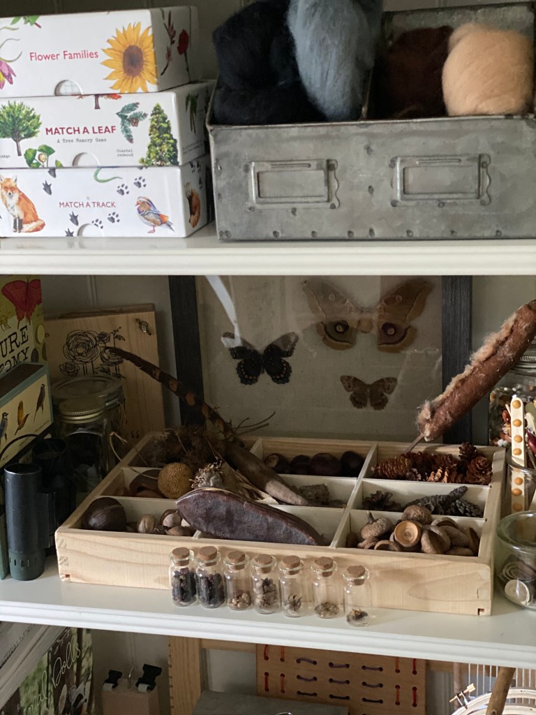 You can also repurpose various packaging. We used this divided wooden tray from a Melissa and Doug car set for our nature treasures.