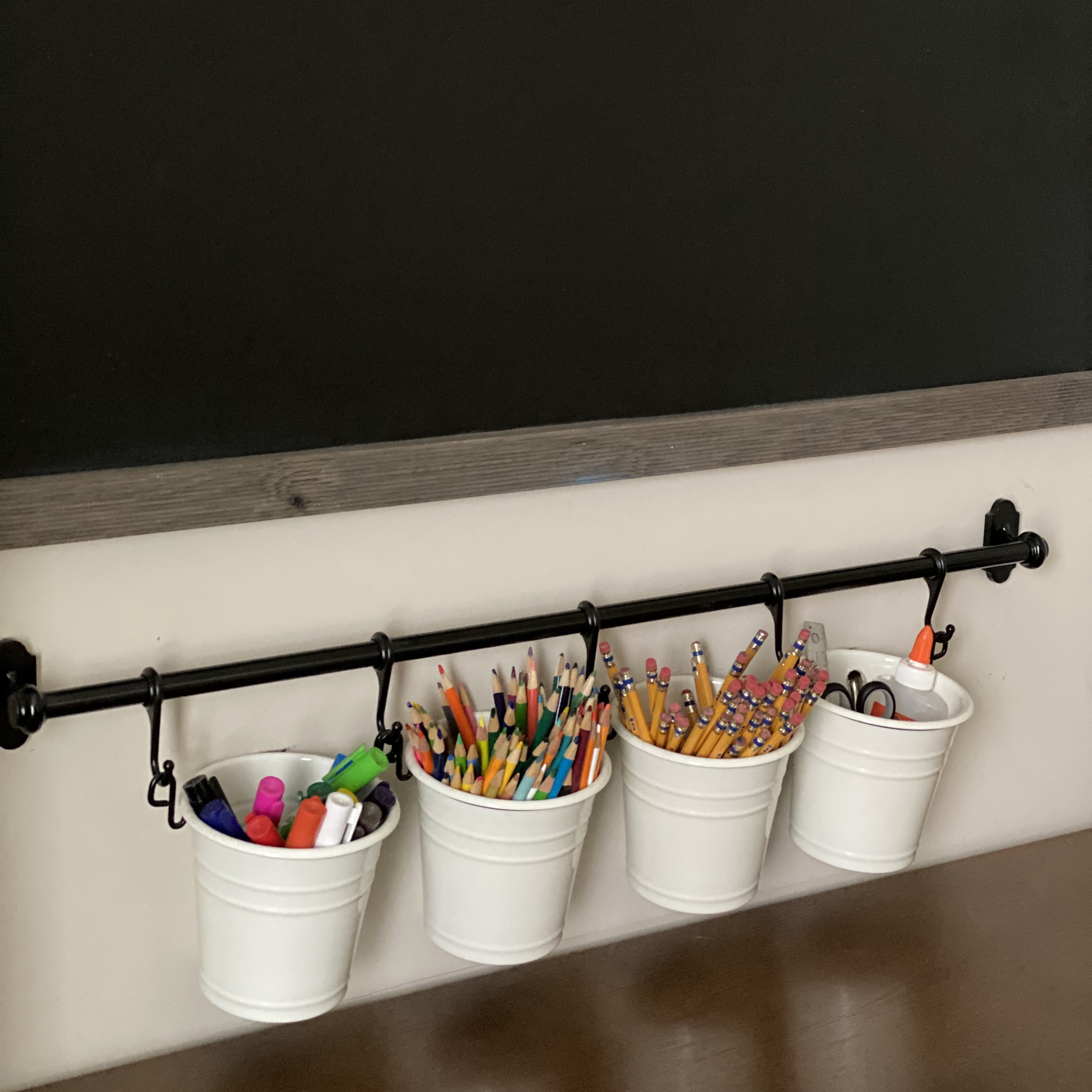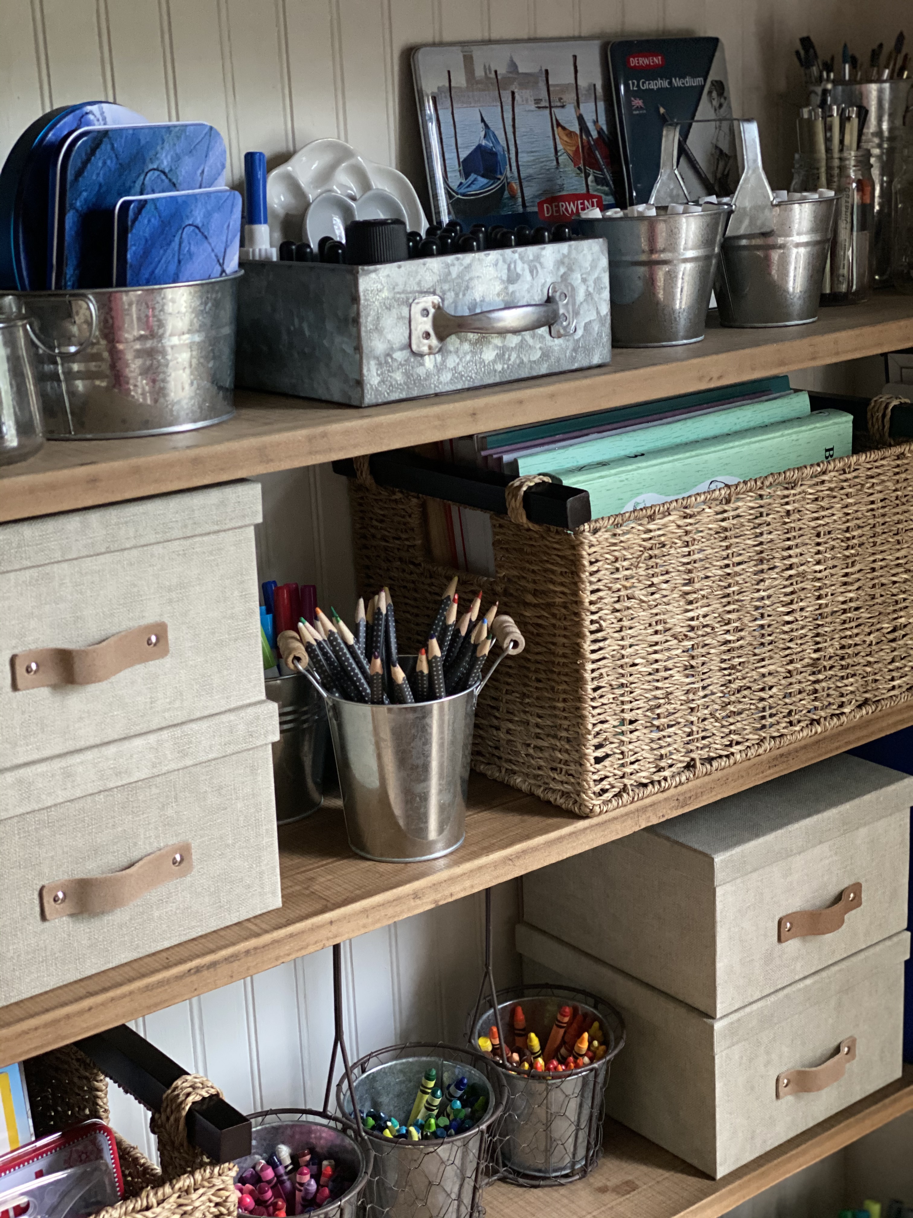 I am a huge fan of buckets for holding art supplies! They’re perfect for pencils, paintbrushes, markers, crayons, you name it! You can find so many various shapes and sizes at Hobby Lobby. We love this utensil holder from Ikea repurposed as art supply storage. You can also store them in a box with a handle for easy transport.