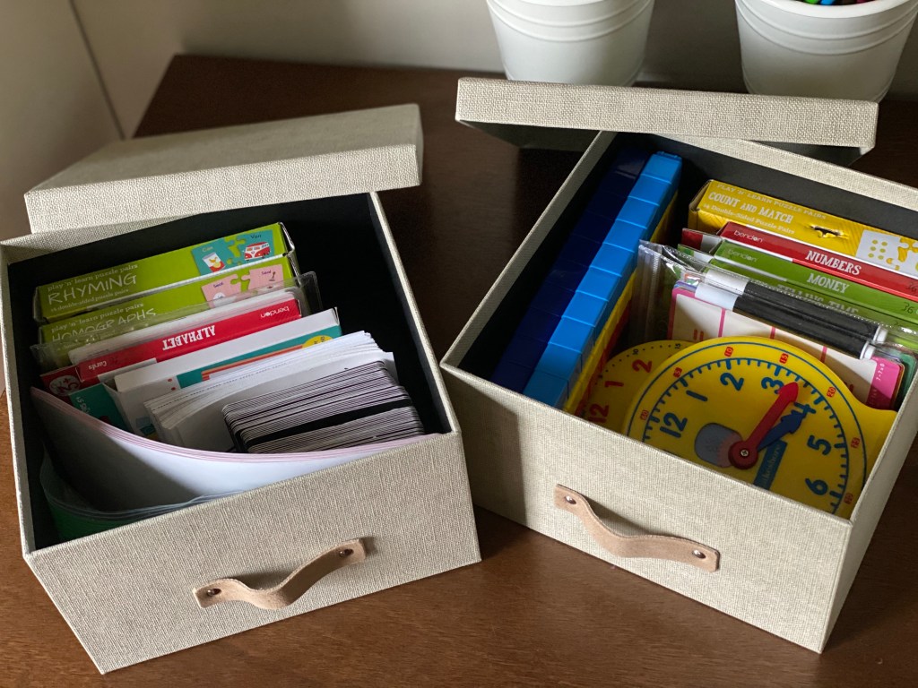 We use a file folder box for storing loose worksheets. I keep worksheets for both of my daughters in the same box separated by weeks. These boxes are also a great option to hold your child’s completed work from throughout the year.