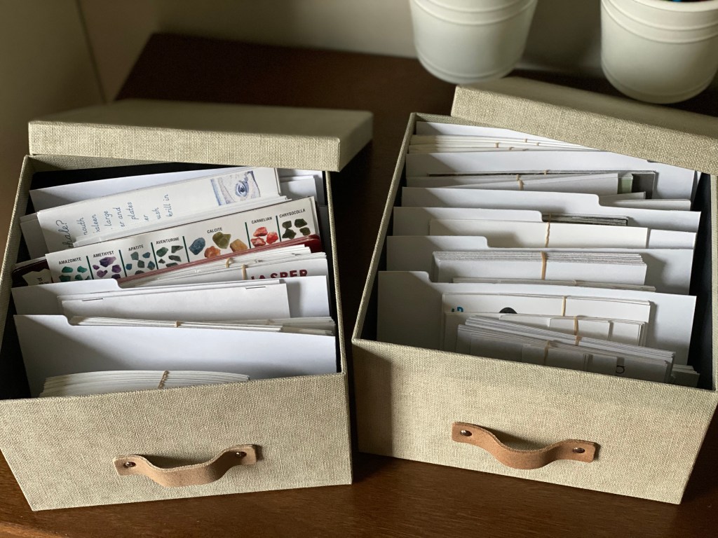 I also use them for nature resources. Any 3 part cards, fact cards, and other small cards are a perfect fit. These particular photo storage boxes come with tabbed dividers so I separate the cards by topic.