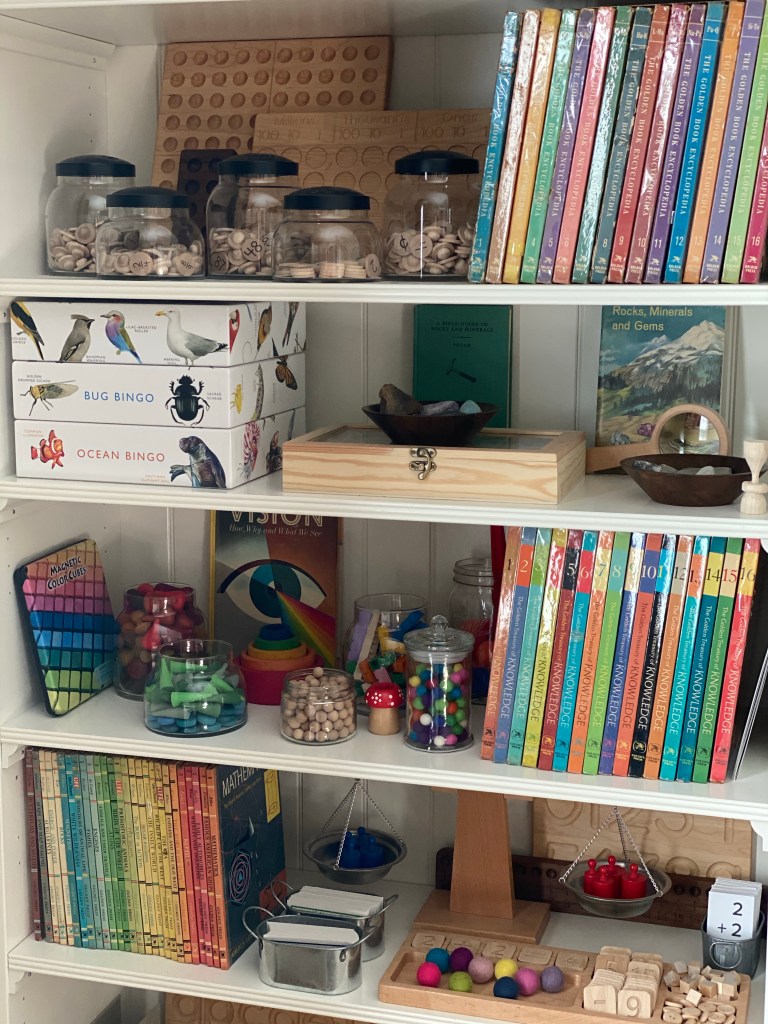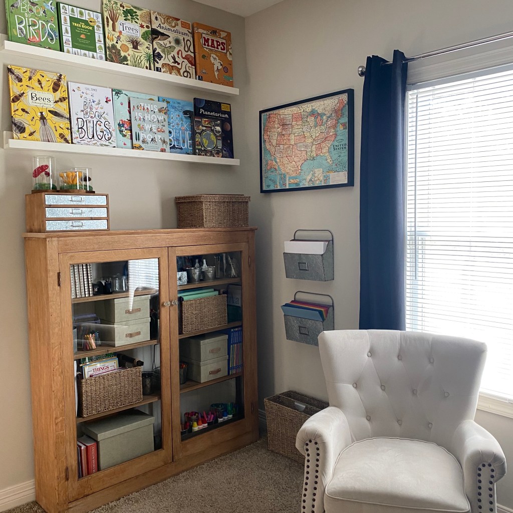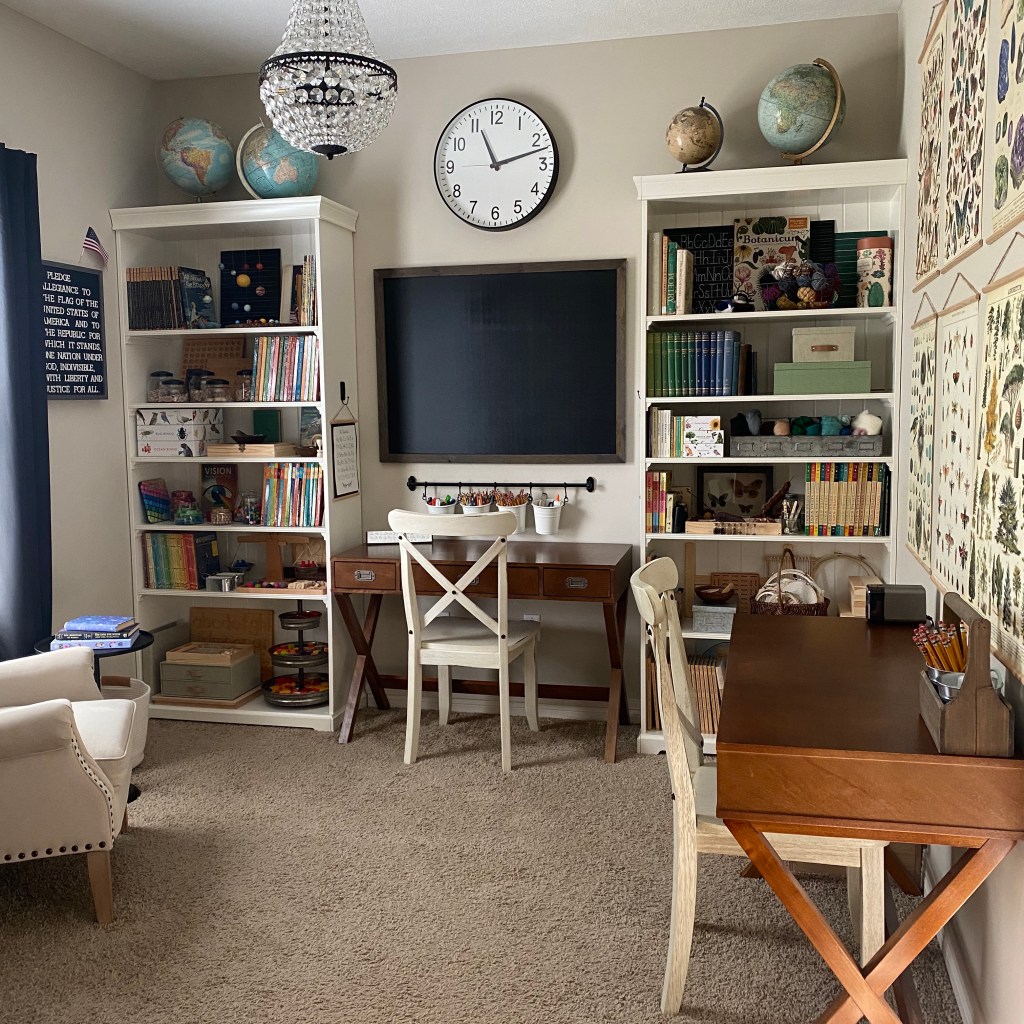 Over the years we’ve added bookcases, a storage cabinet, a comfy chair for me, and another desk for my youngest daughter. Just remember you don’t need all the things! We’ve accumulated resources and books over the years.