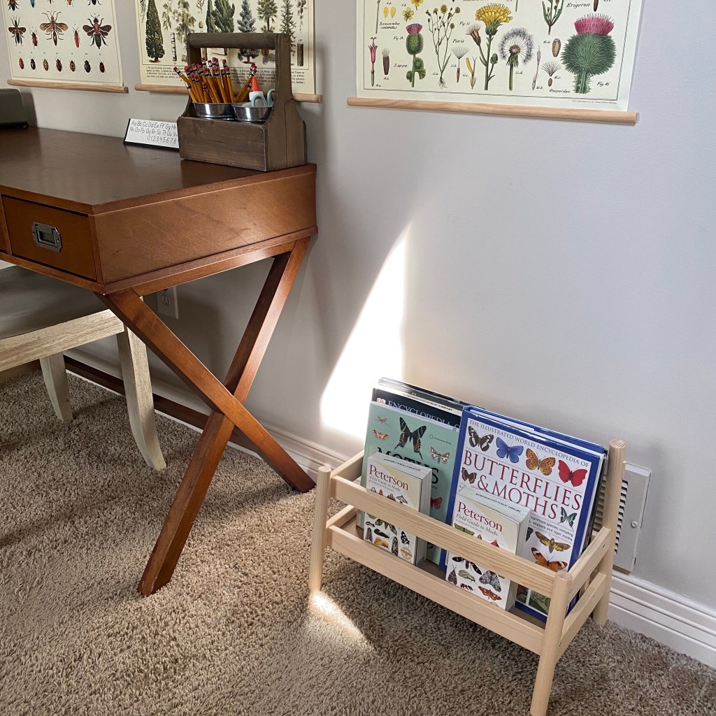 If you are using your living room or even your child’s bedroom a great option for storing supplies is a small bookshelf or cube storage unit. If you have multiple children you can use a separate shelf for each of their books and resources. Or use different shelves for different subjects. I’ve also seen families store all of their resources in a storage tote under the bed. Just pull it out when needed and hide it away when you’re done.