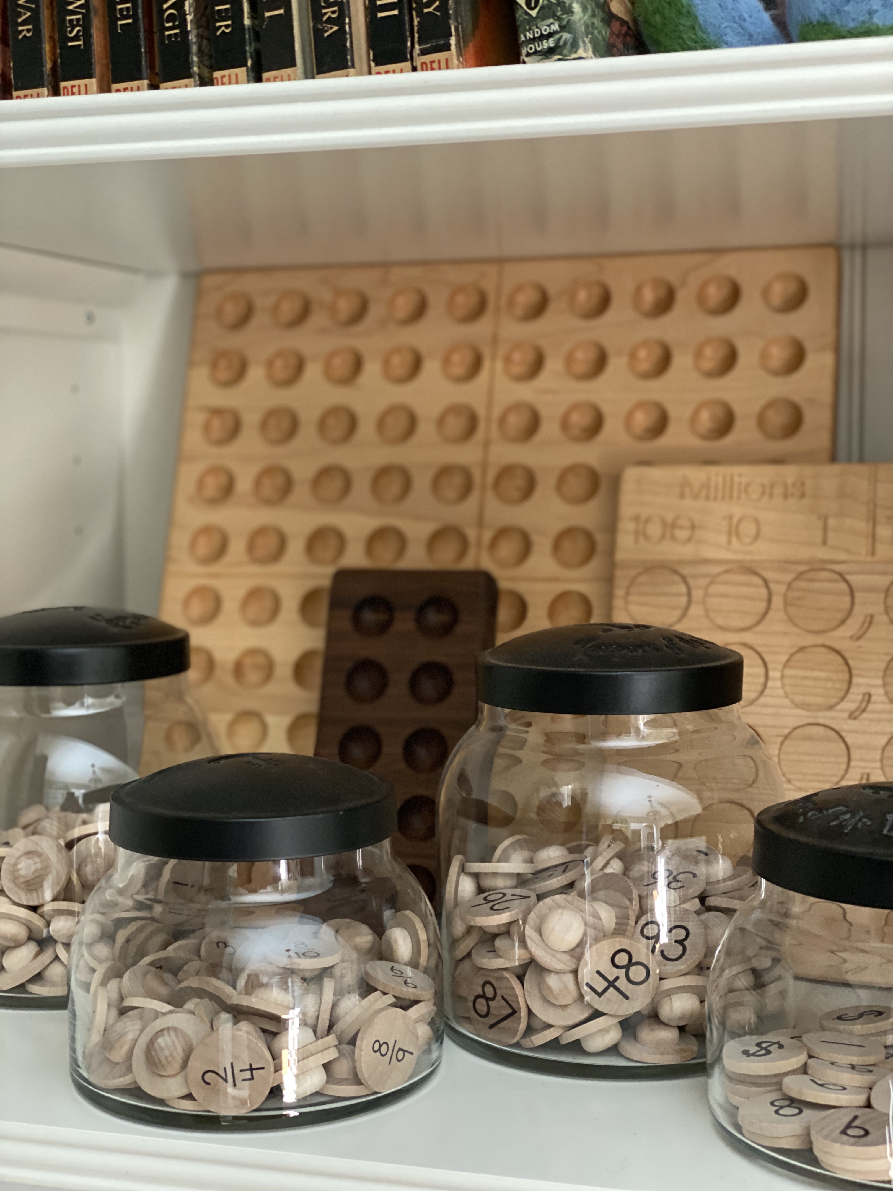 One of my favorite ways to find storage solutions is just by looking around my house! I like to repurpose a lot of jars from marinara sauces or candles. I just clean them out and remove any labels. We store a lot of art supplies, loose parts, and these coins from Treasures From Jennifer in old candle jars.