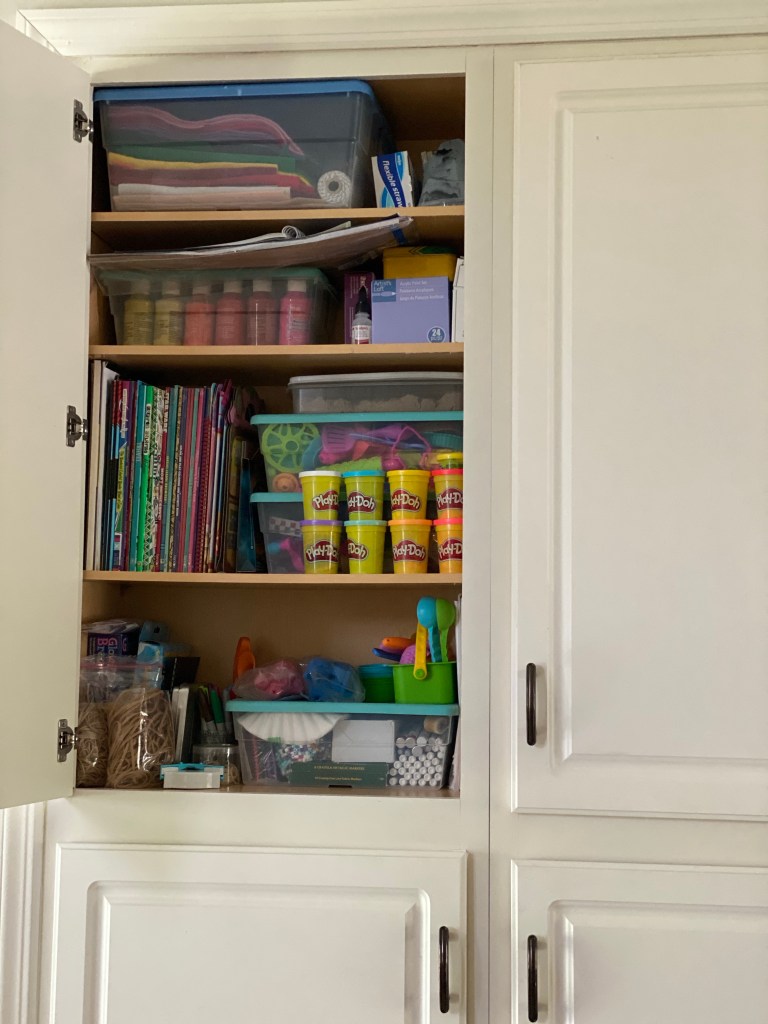 Most homeschool families do school work at the kitchen table. It’s a perfect spot really! Plenty of room for everyone to sit together and sprawl out any books or resources you need to use. If you’re using your kitchen or dining room for homeschool a great way to store things is in a hutch, buffet table, or even a kitchen cabinet! I store a lot of various supplies in the hutch in my kitchen as well as a lot of arts and crafts supplies in a kitchen cabinet.