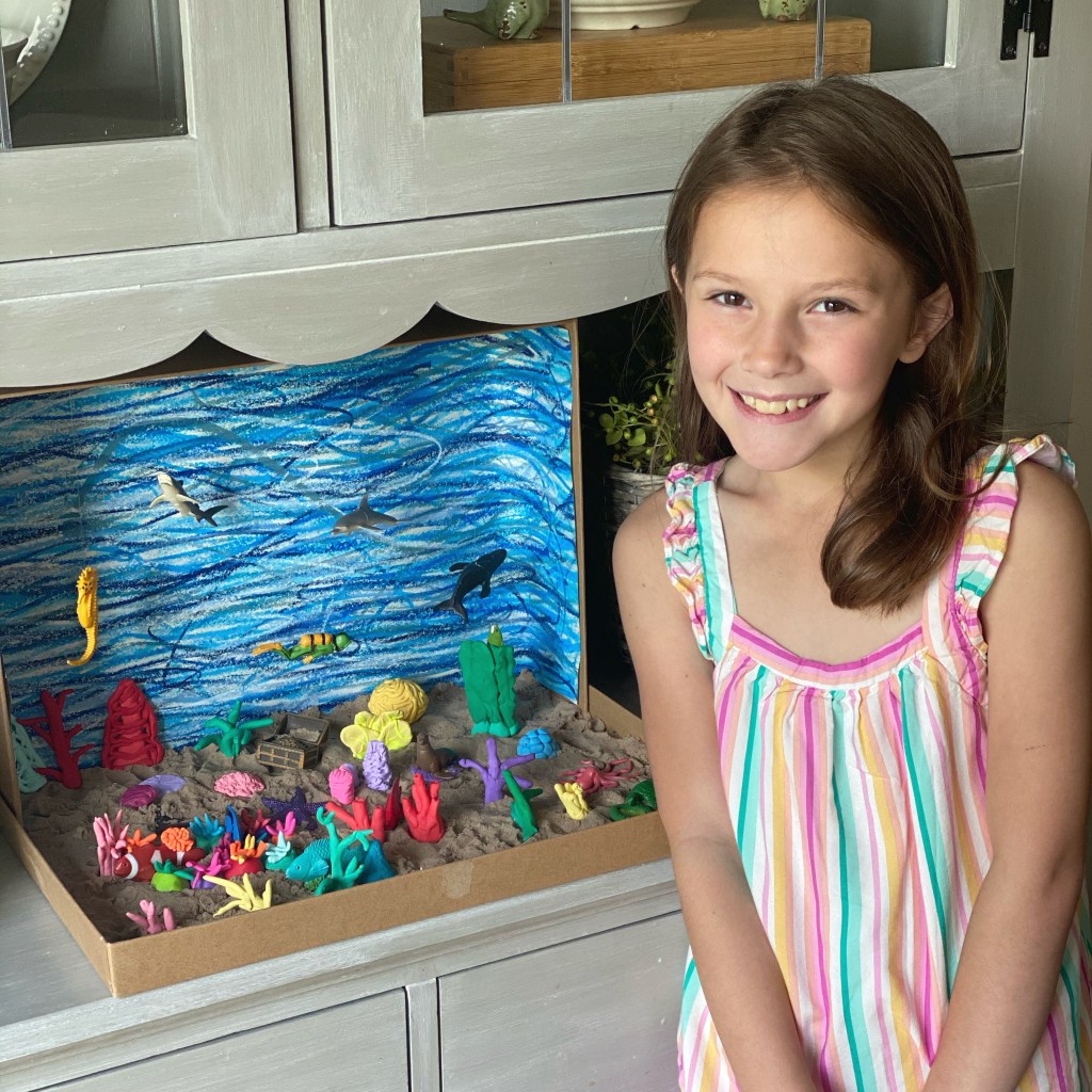 I think this one was the most fun to create. She used paint sticks to create the water background and added kinetic sand for the ocean bottom. Her sister enjoyed helping her make all kinds of coral and anemones out of polymer clay. We watched a few episodes of Planet Earth of the Great Barrier Reef and the ocean while they created. I also set out a few books on coral reefs for them to get ideas on what to create. She also attached some animals hanging from the top of the box with fishing line so it looked like they were swimming. I just love all of the beautiful colors in this one.