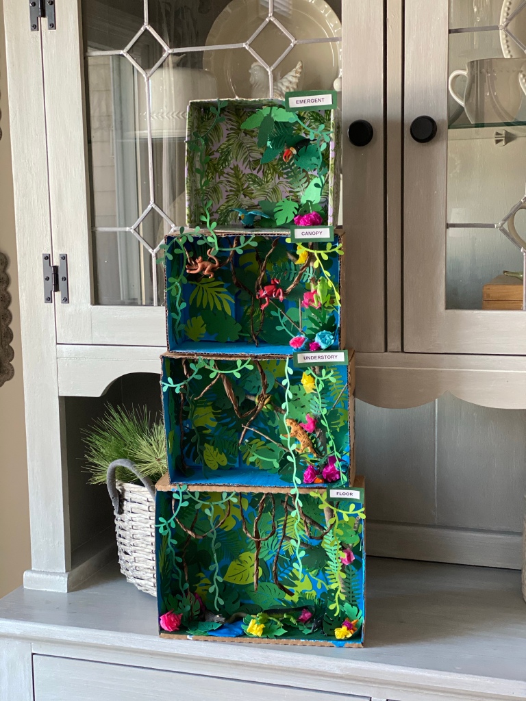 There were a few hands on activities included in the curriculum. But it was mostly reading books and writing facts. My daughter is not a huge fan of writing at this point. So I thought of a fun hands on project she could do while learning all about the biomes of the world. Looking ahead at the lesson plan for the year I noticed there was a diorama project for the rainforest. I thought it would be so fun to create dioramas for all the biomes she would study.