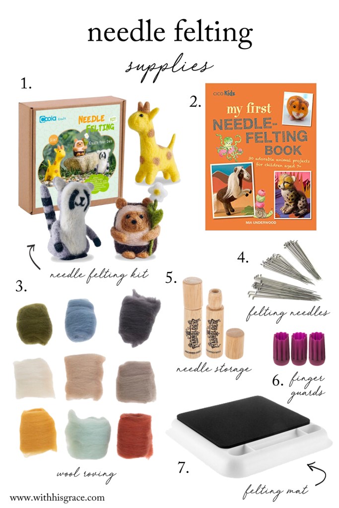 1. Needle Felting Kit | 2. My First Needle Felting Book | 3. Wool Roving | 4. Felting Needles | 5. Needle Storage | 6. Finger Guards | 7. Felting Mat