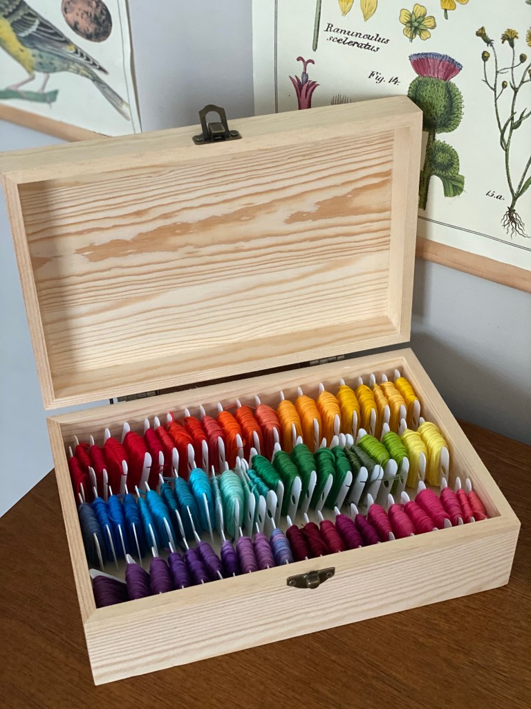 For embroidery floss I like to use one of these winders to place onto bobbins. I separate them by color and store them in wooden containers.