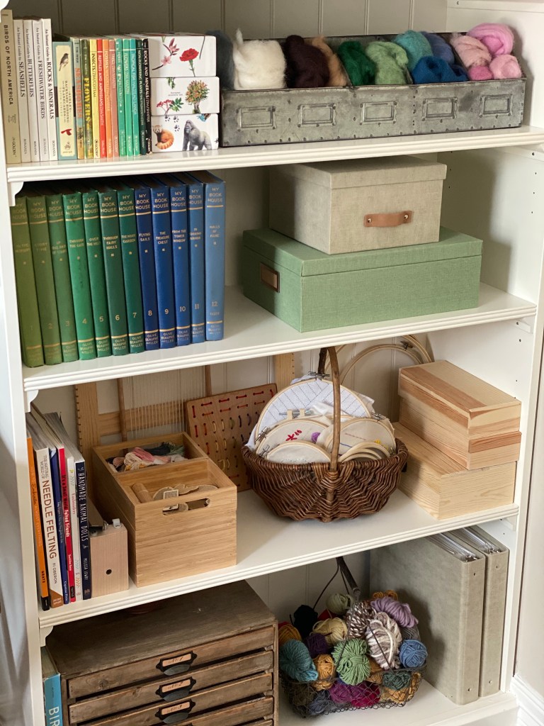 I like to store embroidery hoops and yarn in baskets for easy access. I use this galvanized divided container to store our wool roving by color. I use photo boxes for felt, fabric, and extra wool roving. I love this bamboo box set for holding small supplies and handicrafts we’re working on.