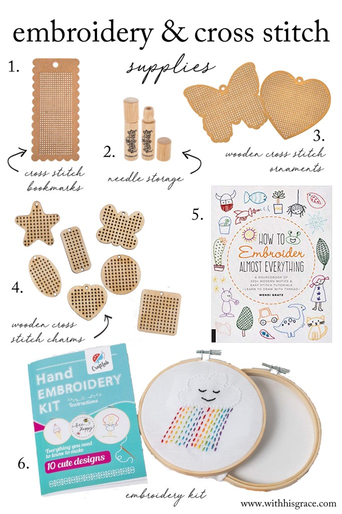 If you’re just starting out I would recommend these embroidery and wooden cross stitch ornament kits I linked below. The kits include all you need to start and finish the projects. I think it helps to get a kit to start out with to see if your child enjoys it before buying a lot of supplies. I also love these sweet wooden animal cross stitch kits.