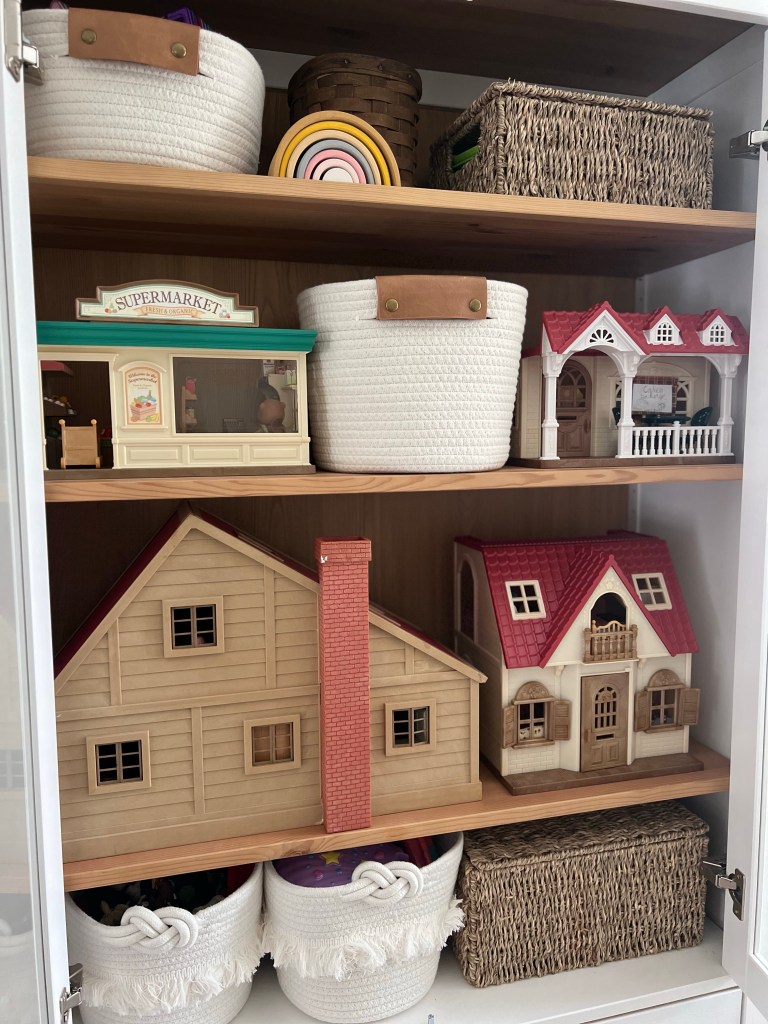 Our Calico Critters houses are on display in the bookcase. The house on the bottom left was my Sylvanian Family house when I was little! Most of the furniture stays inside the houses. The animals and other furniture accessories are kept in a rope basket.