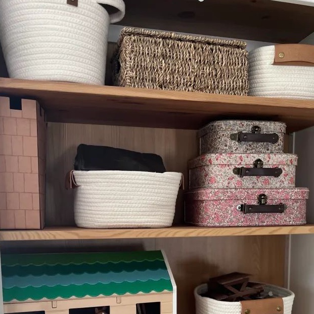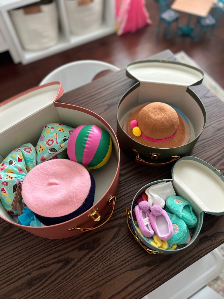 We used small decorative suitcases from Target to hold socks, slippers, hats, and coats. Unfortunately they are no longer available. I’ll link a similar set.