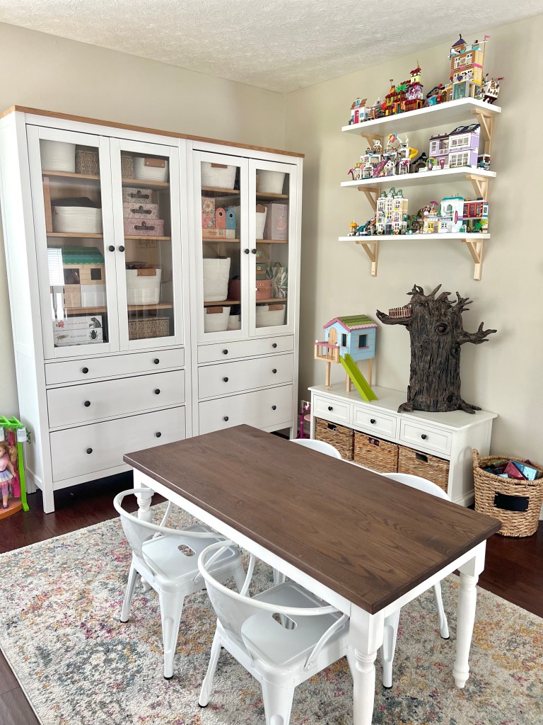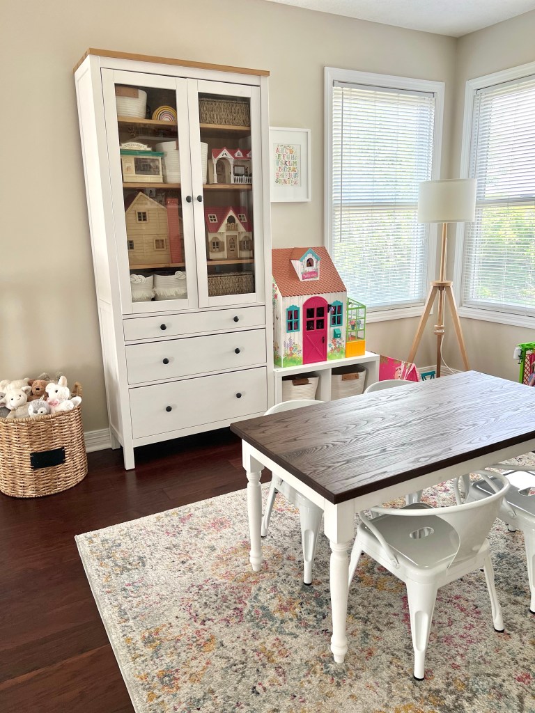 Since the playroom is open I wanted it to feel cohesive with the rest of our house. I decided to keep the furniture mostly white with some wood accents. The rug matches the one in my girls’ bedroom. I love the muted colors and thought it went went with the toys that are on display.