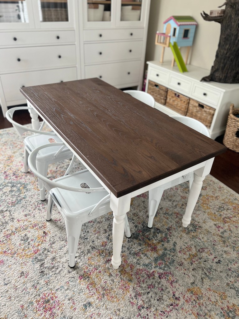We’ve always had a small table in here. The one we had when we first moved in had seen better days, so my husband built a new one. It measures 24” x 48” and is 22” high. I found the cutest metal chairs at Walmart that are surprisingly comfortable. They also come in various colors.