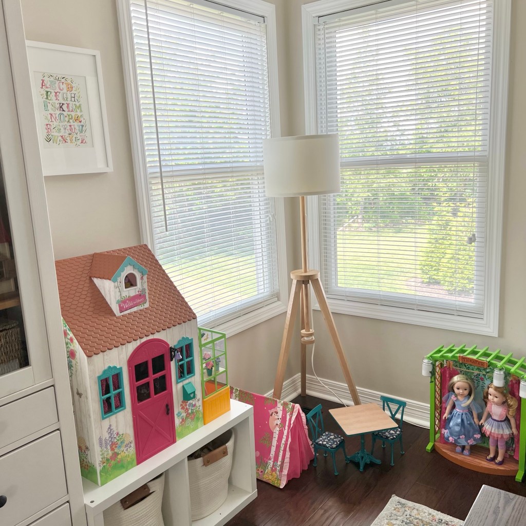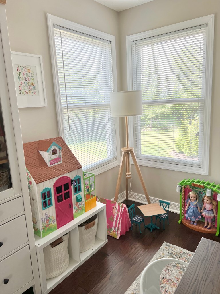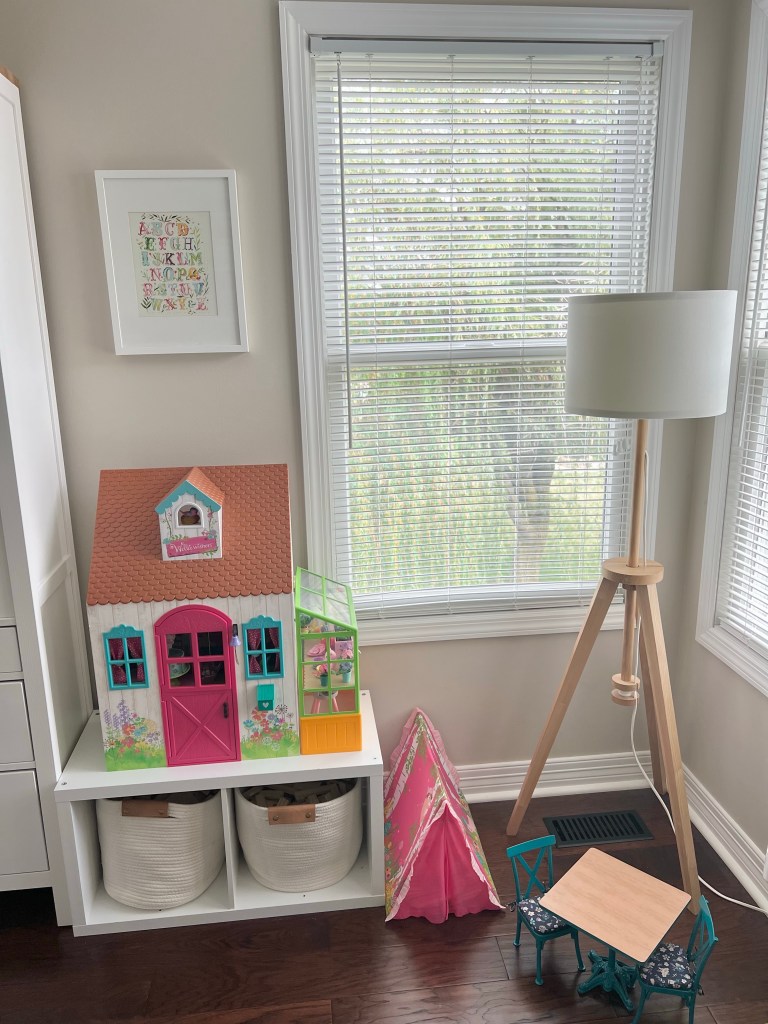 This room doesn’t have any overhead lighting. It can get a little dark in there in the evenings even when the lights are on in the living room and hallway. I found the perfect floor lamp that matches the furniture and doesn’t take up too much space. I like how it is open at the bottom since the only location I could put it is in the corner where the vent is located. As far as wall decor, there isn’t much room for any. I have this cute little alphabet print that I’ve had since Emma was two. I thought the colors went well with the toys and rug.