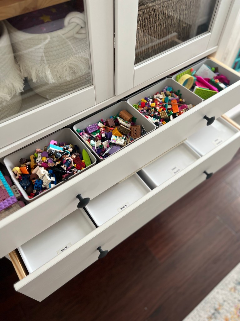 For the loose legos I decided it would be easiest to store them in containers and keep them in the drawers for easy access. I took measurements of the inside of the drawers to determine what would fit best inside. I found some tiny containers at Ikea for small pieces, people, and cars. Unfortunately they are no longer available. I’ll link ones that are similar, but twice the length. The rest of the legos I wanted to separate by color. I found these lidded containers that could stack on each other and fit inside the middle drawer. I added labels of the colors on the lids.