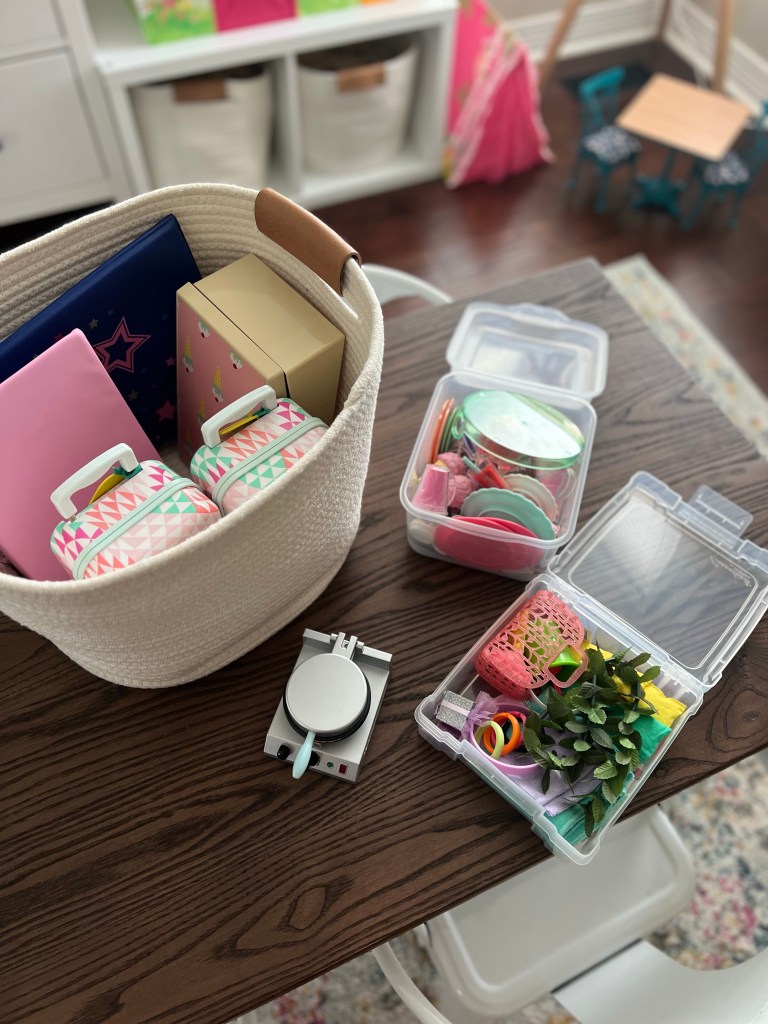 We also have some larger accessories and furniture items I needed to store. For those pieces I used a large rope basket. I found a few small containers to hold food and other accessories.
