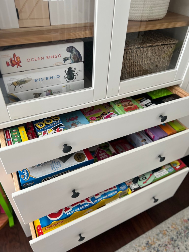 The top drawer holds card games and other small games. The bottom two drawers are very deep and holds a lot of larger board games.